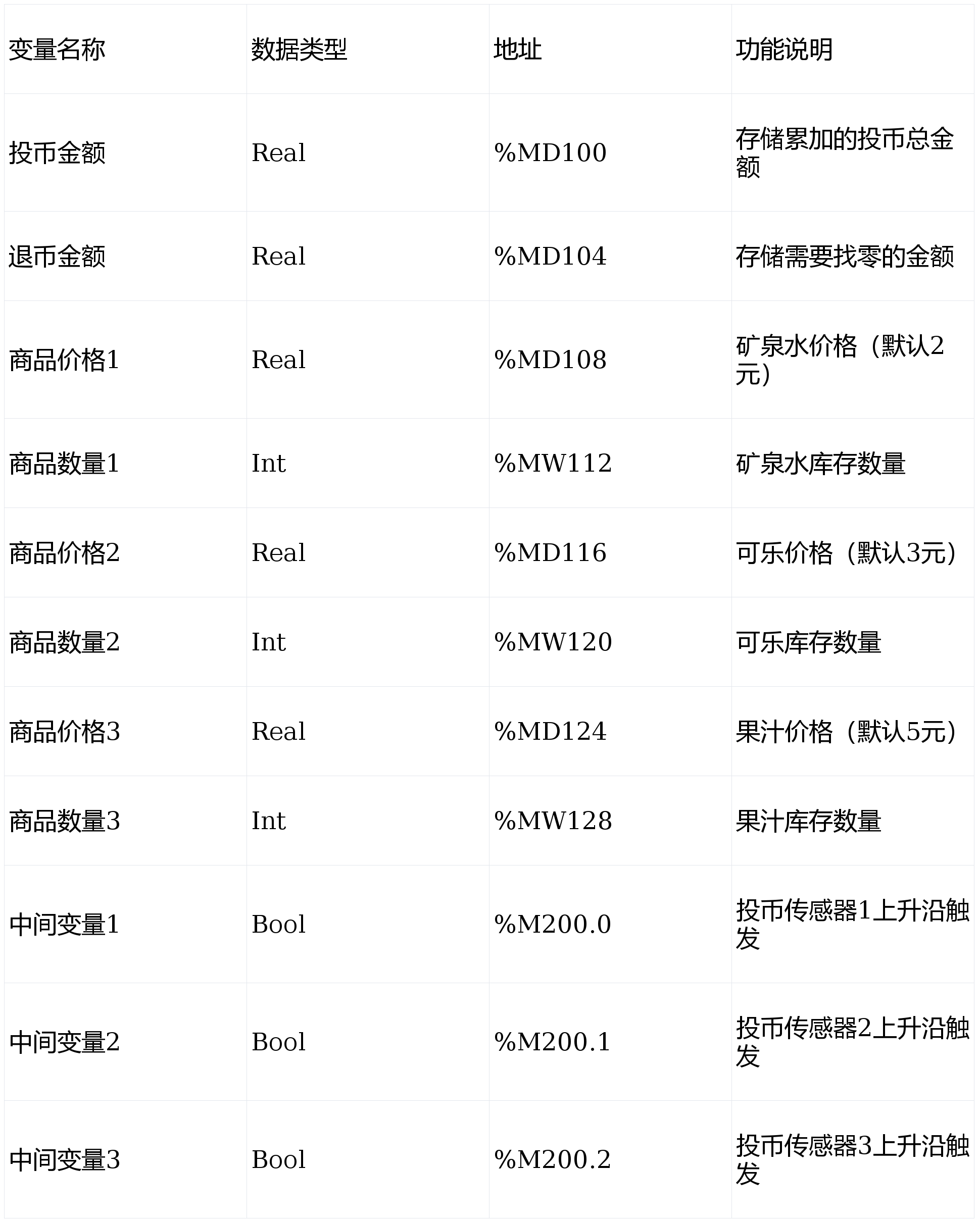 - 功能:PLC首次扫描时,初始化商品价格(矿泉水2元、可乐3元、果汁5元)、初始库存数量(各20件)、投币金额与退币金额清零。
