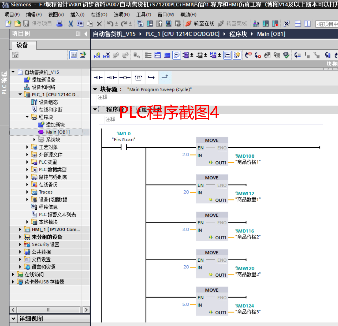 - 完成了基于西门子1200PLC与博途软件的自动售货机控制系统设计,包括硬件选型、IO分配、电路设计、软件编程与HMI组态。