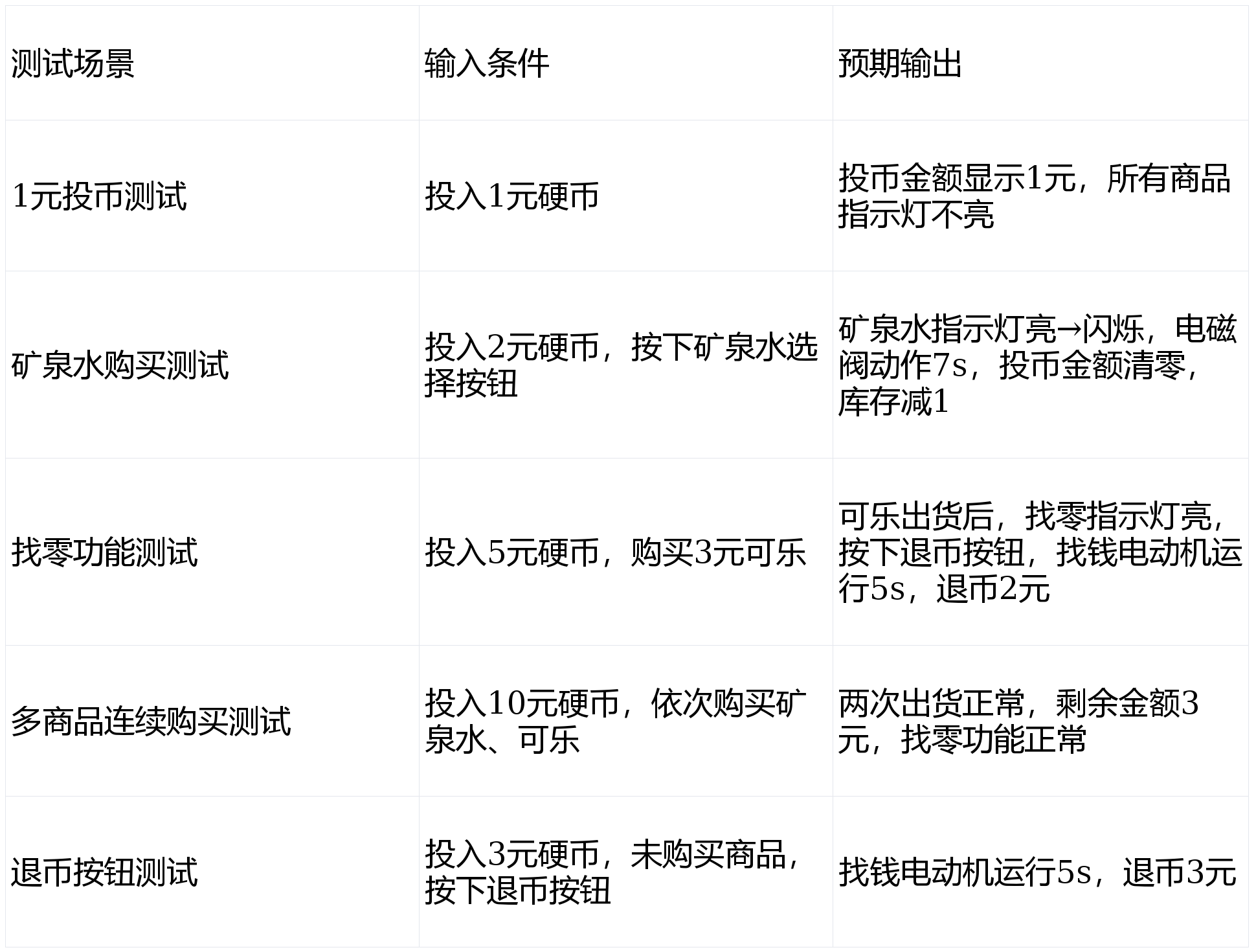 - 商品选择与出货测试:验证投币金额满足条件时,商品指示灯亮,按下按钮后出货动作与时间控制准确性,库存扣减正确性。