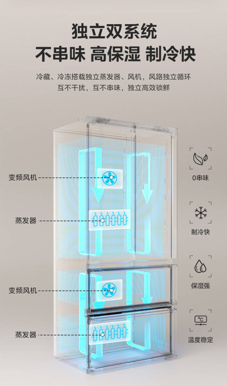 - 独立双循环系统,避免串味,提升冷藏效果。