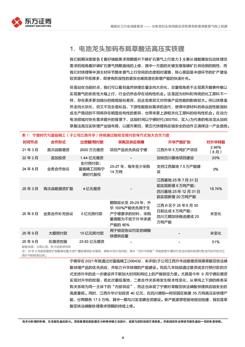 行业龙头企业的动向往往预示技术风向。近年来,宁德时代通过持续增资、支付预付款乃至计划控股等方式,深度绑定国内草酸亚铁法磷酸铁锂的代表企业江西升华。这一系列动作,远超出了普通的采购合作,更透露出对“草铁法”这一特定技术路径供应链安全的高度重视。该技术被视为规模化生产高压实铁锂的关键路径之一,其产能的加速扩张,背后是市场对其需求预期的不断上修。