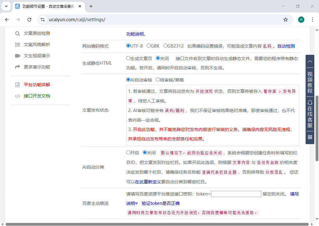 发bu环节更是让我这种技术小白目瞪口呆。配置好接口(它连各种自媒体平台的接口都支持),文章就能自动发bu。可以设置发bu时间间隔,可以聚合发bu,可以自动推送到百度。