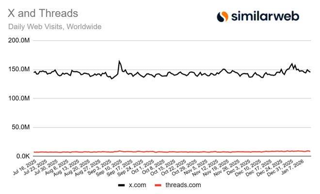 Similarweb 数据显示,截至 2026 年 1 月 7 日,Threads 在 iOS、Android 平台的日活跃用户数达 1.415 亿,而 X 平台在这两个移动平台的日活数为 1.25 亿。