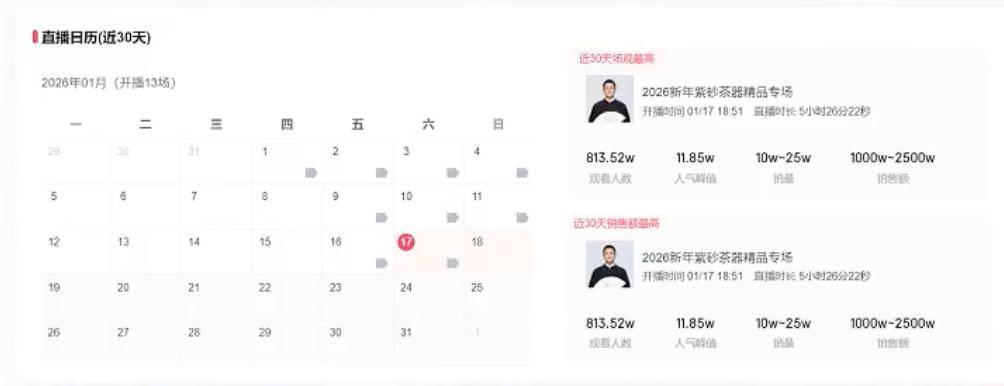 1月18日,@读秒财经 搜索发现,据第三方数据平台,李亚鹏1月17日直播5个小时,销量在10万-25万,销售额在1000万-2500万元,为近30天销售额最高的直播。
