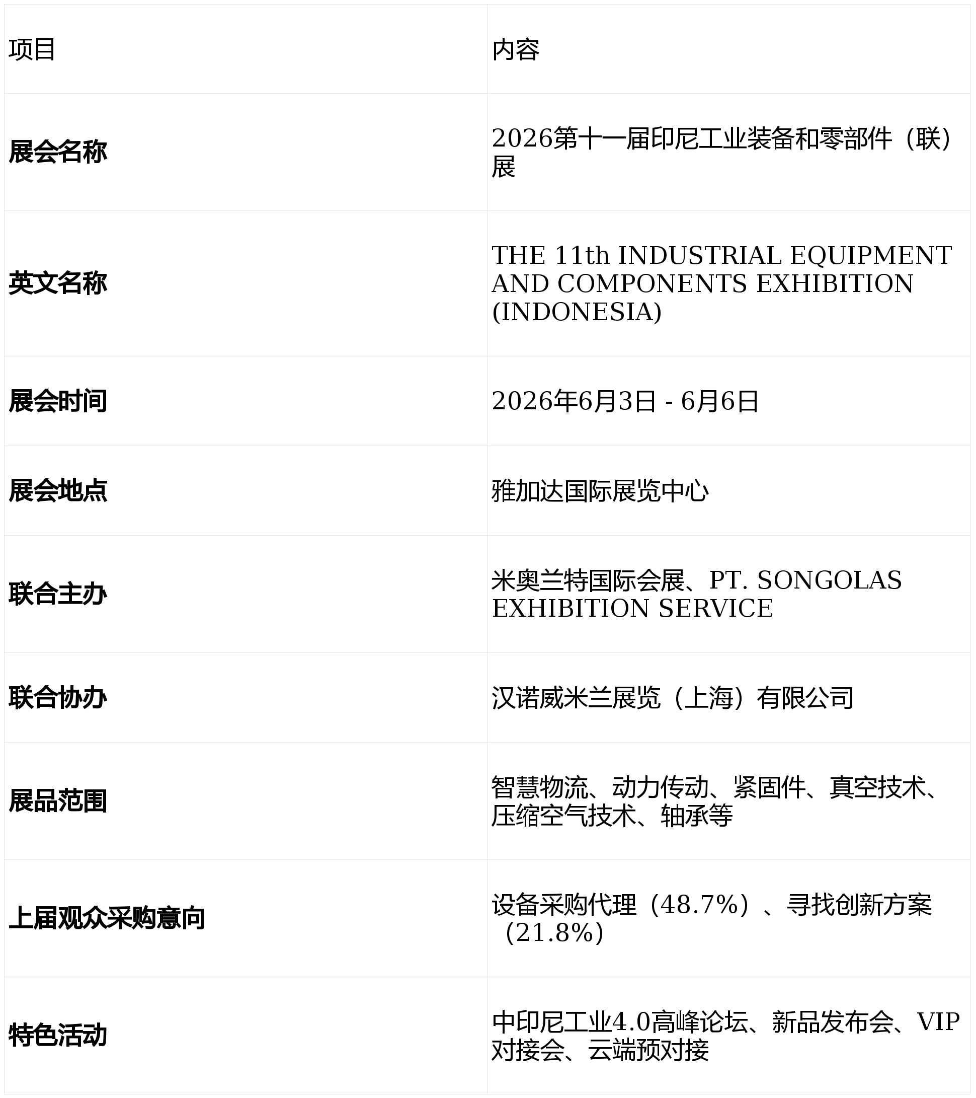 印尼工业装备和零部件(联)展也顺势而生,以下是展会相关的基础信息: