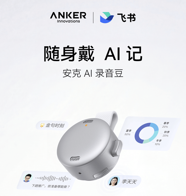 2026年1月19日,安克创新与飞书联合发布了最新AI硬件——安克AI录音豆,飞书提供了该产品的软件AI适配与服务。这款产品以极轻的"磁吸纽扣”形态实现无感随身佩戴,基于飞书AI能力,支持声纹识别、实时转写与翻译、实时AI可视化总结以及智能纪要生成,结合飞书知识问答,将录音变成可协同、可流转的知识资产。