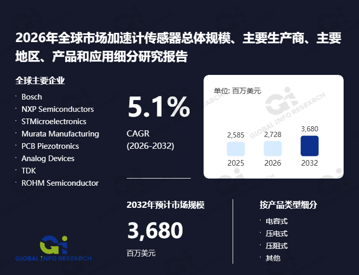 近期,全球知名市场研究机构环洋市场咨询发布了最新市场研究报告,标题为“2026年全球市场加速计传感器总体规模、主要生产商、主要地区、产品和应用细分研究报告”。该报告对加速计传感器市场进行了系统性、多维度的调研,覆盖全球主要区域市场、产业链结构、竞争格局及未来发展趋势,旨在为行业决策者提供深入的市场洞察。
