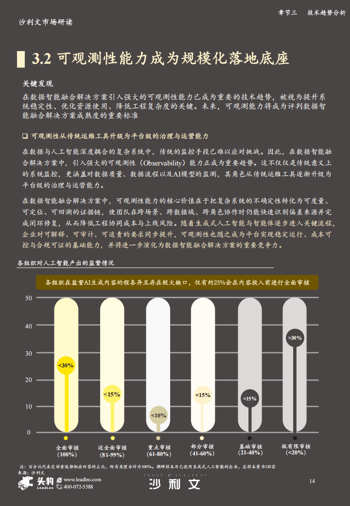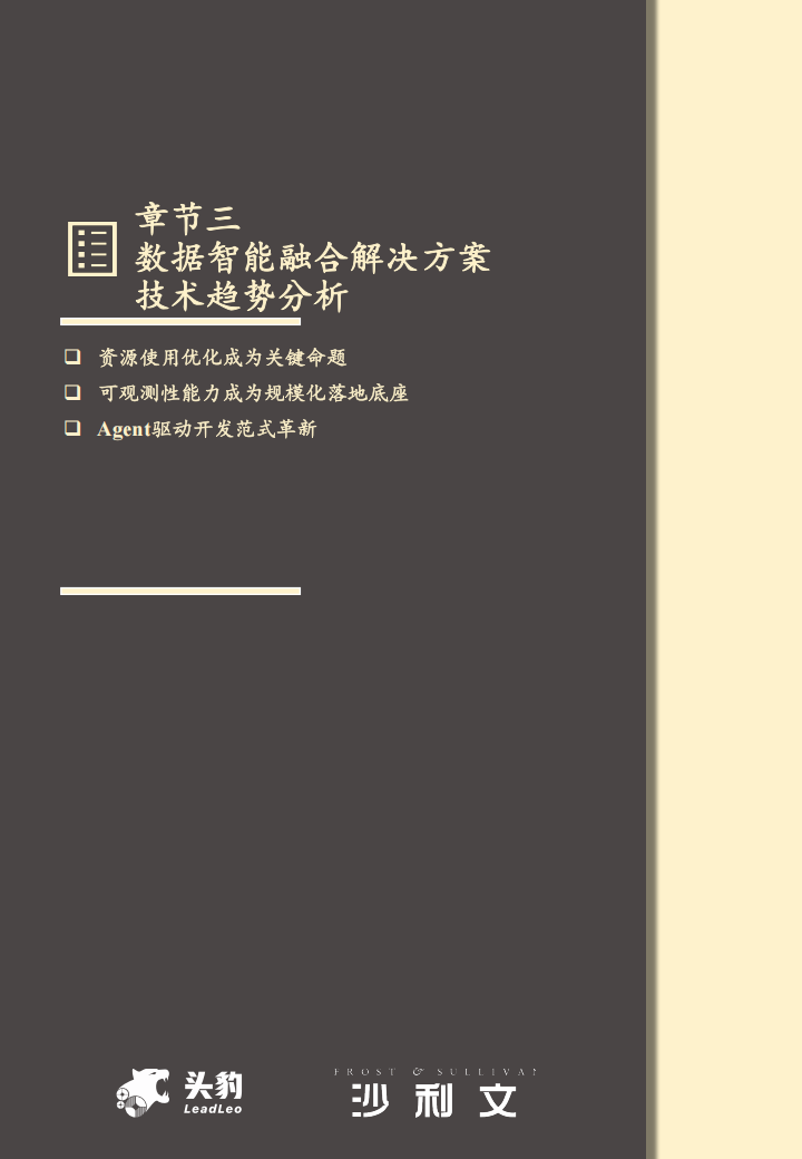 技术趋势方面,解决方案正从多样功能覆盖转向规模化可运营升级。资源使用优化决定平台扩展的成本与弹性边界,可观测性成为系统稳定运行与可追溯治理的底座,而AI Agent推动数据平台从辅助分析走向流程执行,实现自动化交付与闭环运营,预计2030年将实现规模化落地。