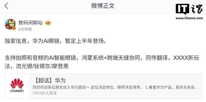 IT之家 1 月 20 日消息,据博主 @数码闲聊站 今日(1 月 20 日)爆料,华为 AI 眼镜暂定上半年登场,支持拍照和音频,鸿蒙系统 + 跨端无缝协同,同传翻译,XXXX 新玩法,流光银 / 钛银灰 / 摩登黑。