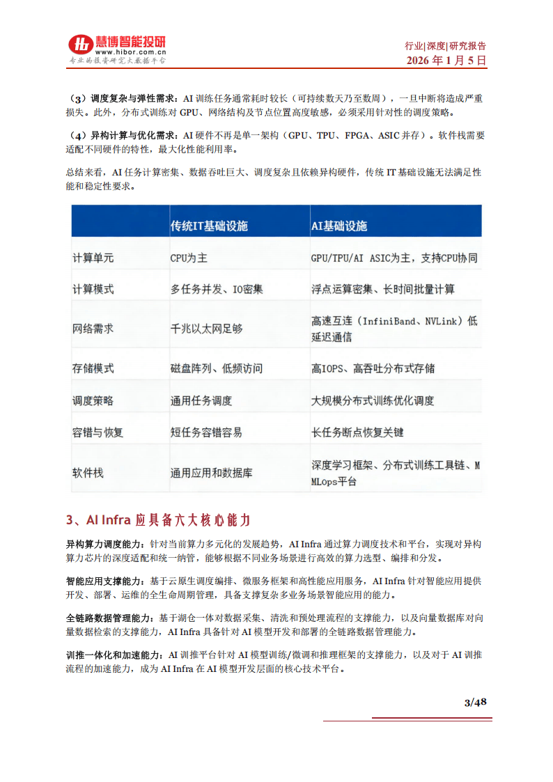 AI基础设施远非传统IT系统的简单升级。它是一套专门为AI工作负载设计、构建与优化的底层硬件与软件系统集合,涵盖了从算力芯片、高速网络、分布式存储,到训练框架、调度平台、运维管理的全栈技术。与传统IT架构追求多任务并发和IO处理不同,AI任务具有计算极度密集、数据吞吐海量、调度高度复杂以及依赖异构硬件的鲜明特点。这要求基础设施必须具备六大核心能力:高效调度多元算力、智能应用全生命周期支撑、全链路数据管理、训练推理一体化加速、全方位安全体系构建以及场景化服务能力,方能成为孕育AI应用落地的“肥沃土壤”。