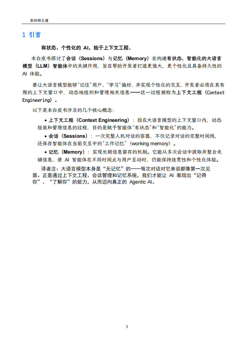 该白皮书聚焦上下文工程在构建有状态、个性化AI智能体中的核心作用,深入剖析了会话与记忆两大关键组件的设计原理、实现方式及生产应用考量,为开发者打造高效智能体提供了系统性指导。