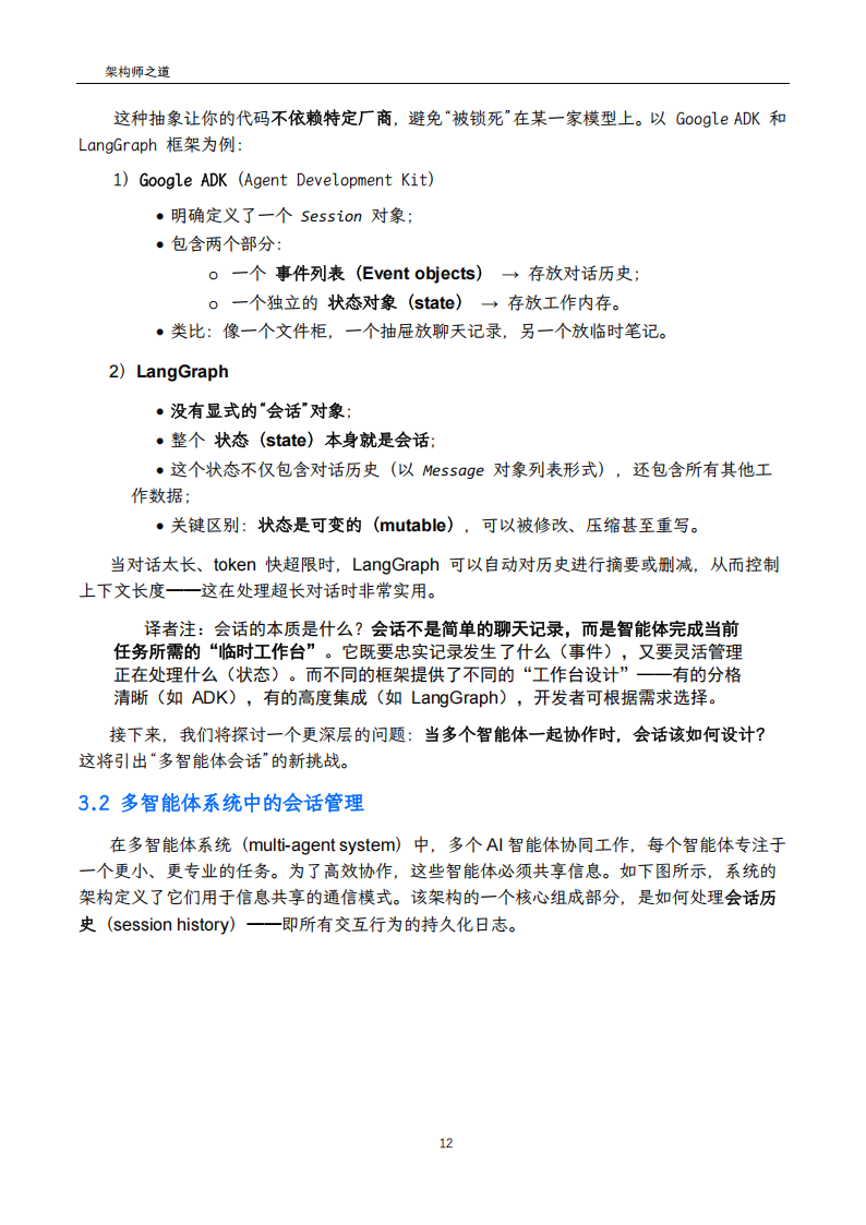 会话作为单次人机对话的容器,封装了事件日志和工作状态,记录对话全流程与临时数据。不同框架(如Google ADK、LangGraph)对会话的实现各有差异,生产环境需注重会话的持久化存储、安全隔离与生命周期管理。针对长对话场景,需通过滑动窗口、递归摘要等压缩策略,在保留关键信息的同时控制token消耗、降低成本与延迟。多智能体系统中,会话管理分为共享统一历史和独立个体历史两种模式,而基于记忆的框架无关数据层是实现跨框架互操作性的关键。