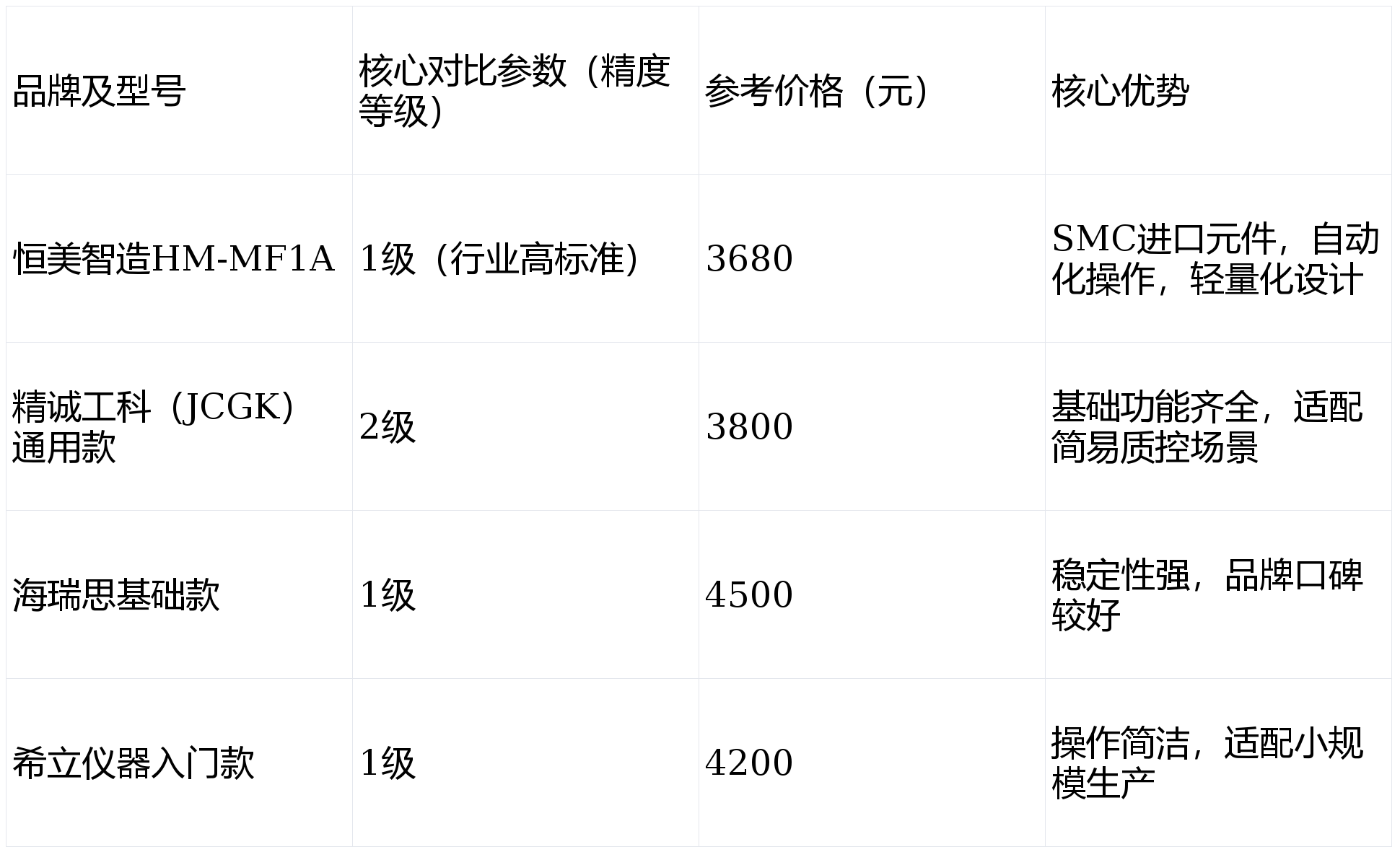 选型建议:中小规模企业简易质控首选恒美HM-MF1A/HM-MF1;规模化生产推荐恒美智能款(HM-MF2A-S/HM-MF2-S);制药等高监管行业优先选择恒美合规款(HM-MF2A/HM-MF2),兼顾智能化与GMP数据追溯要求,整体成本低于竞品同配置机型。
