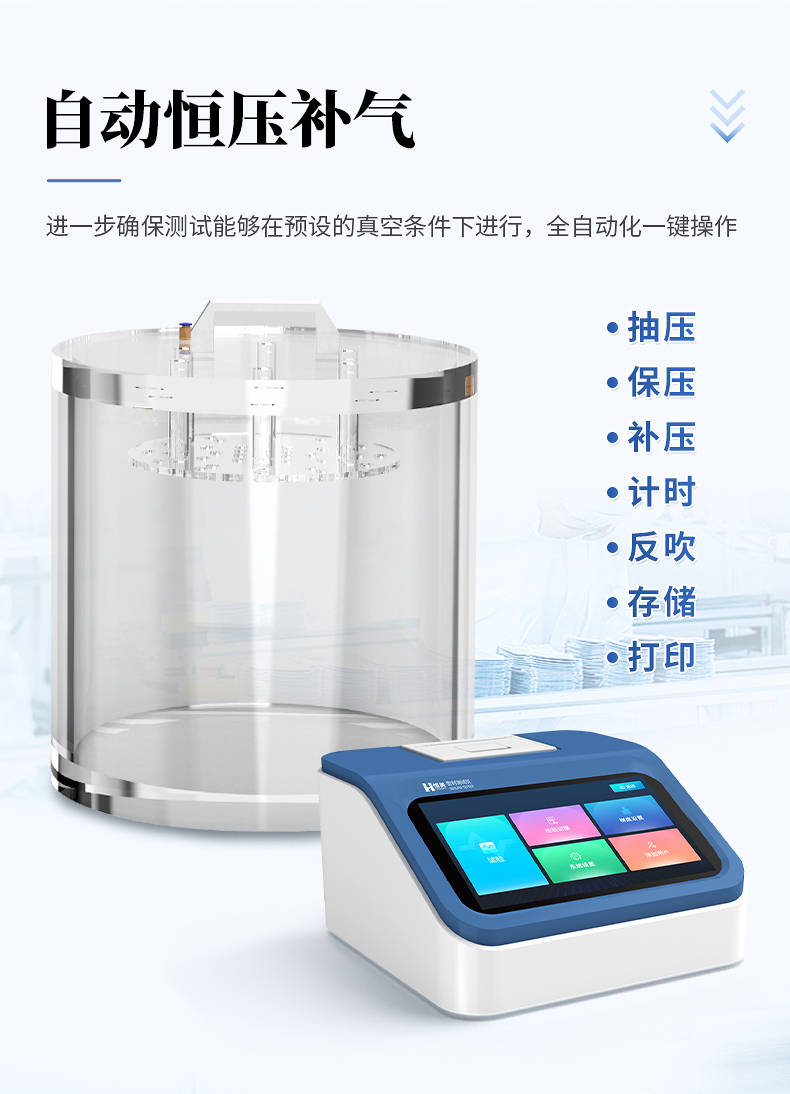 精度是密封性测试仪的核心指标,直接决定检测结果的可靠性。恒美HM-MF1A采用1级精度设计,搭配数字预置真空度及保压时间功能,可精准控制0~-90kPa真空范围与0~9999s保压时长,结合SMC进口气动元件与自动恒压补气技术,确保测试全程压力稳定,无波动误差。