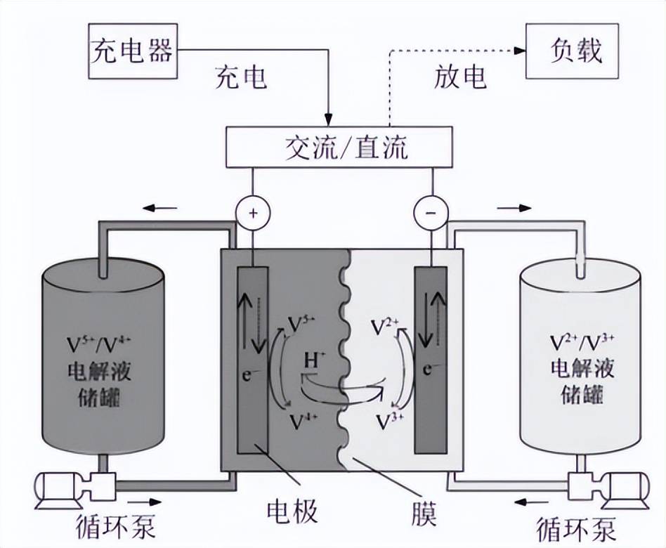 液流电池是一种特殊类型的可充电电池,其基本结构包括电解液储罐、电泵、反应堆、膜电极组件和电极等部分,电解液通常由含有可逆氧化还原对的溶液组成。