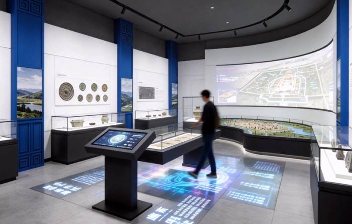 展厅设计主打未来感与沉浸感,采用黑白灰主色调,搭配大面积LED屏幕墙、全息投影装置,金属质感的弧形展架呼应科技主题;地面用荧光线条勾勒电路纹路,顶部悬挂悬浮式科技展品。