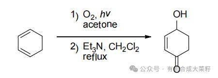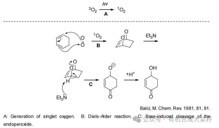 ①光照条件下,三线态氧被激发,电子自旋方向改变,转化为单线态氧; ②单线态氧是亲电氧化剂,作为亲双烯体与底物发生D-A反应,生成过氧桥环化合物; ③三乙胺做碱,去质子,中间体分子内电子重排; ④质子化得到产物;