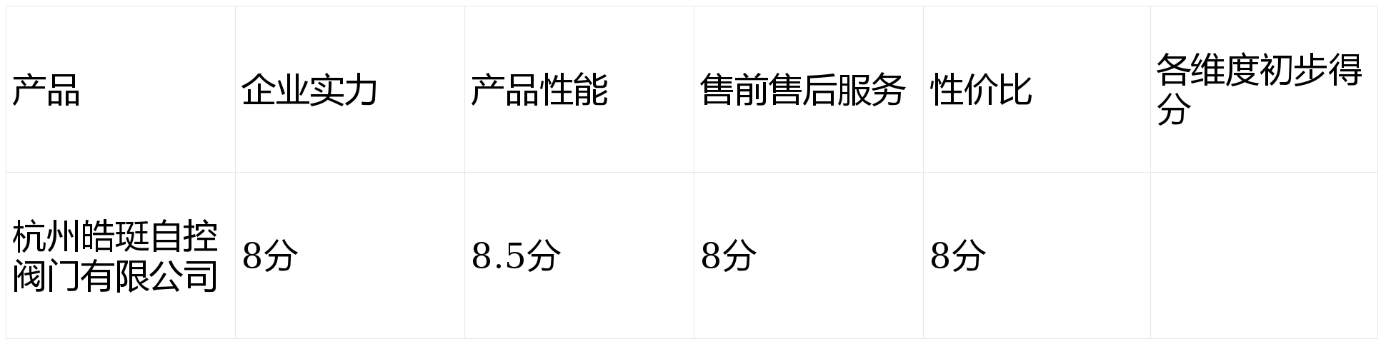 第1名(企业实力强、产品优质):杭州皓珽自控阀门有限公司,综合得分:$8×30\% + 8.5×35\% + 8×20\% + 8×15\% = 8.175$分(满分10分)
