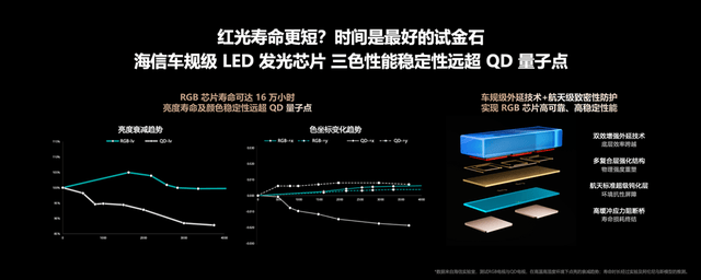 用户日常使用中,采用RGB真彩背光的海信E8S更是带来双重增益:一是节能40%以上,长期使用可显著降低电费支出,更契合绿色家居需求;二是硬件级减少42%有害蓝光,实现护眼不偏色,老人、儿童长时间观看也更安心。稳定性方面,搭载乾照光电全自研车规级发光芯片,经85℃高温、60mA大电流极限测试,红光芯片寿命突破16万小时,超十年不褪色,耐用性远超易老化的量子点方案。