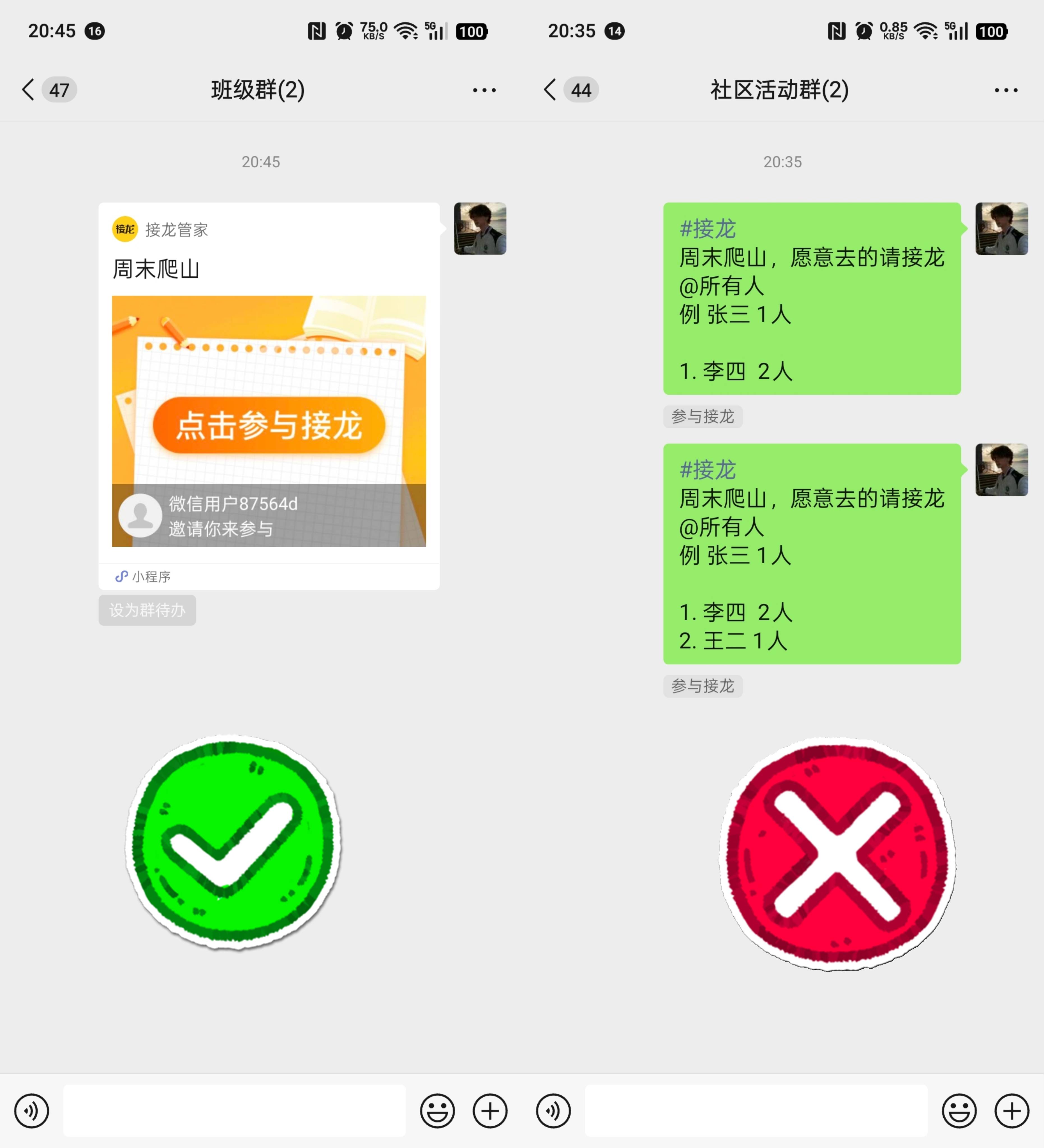 “家长们,游学报名请回复‘姓名 + 人数’……”“周六爬山活动,参加的朋友接龙报个名……”