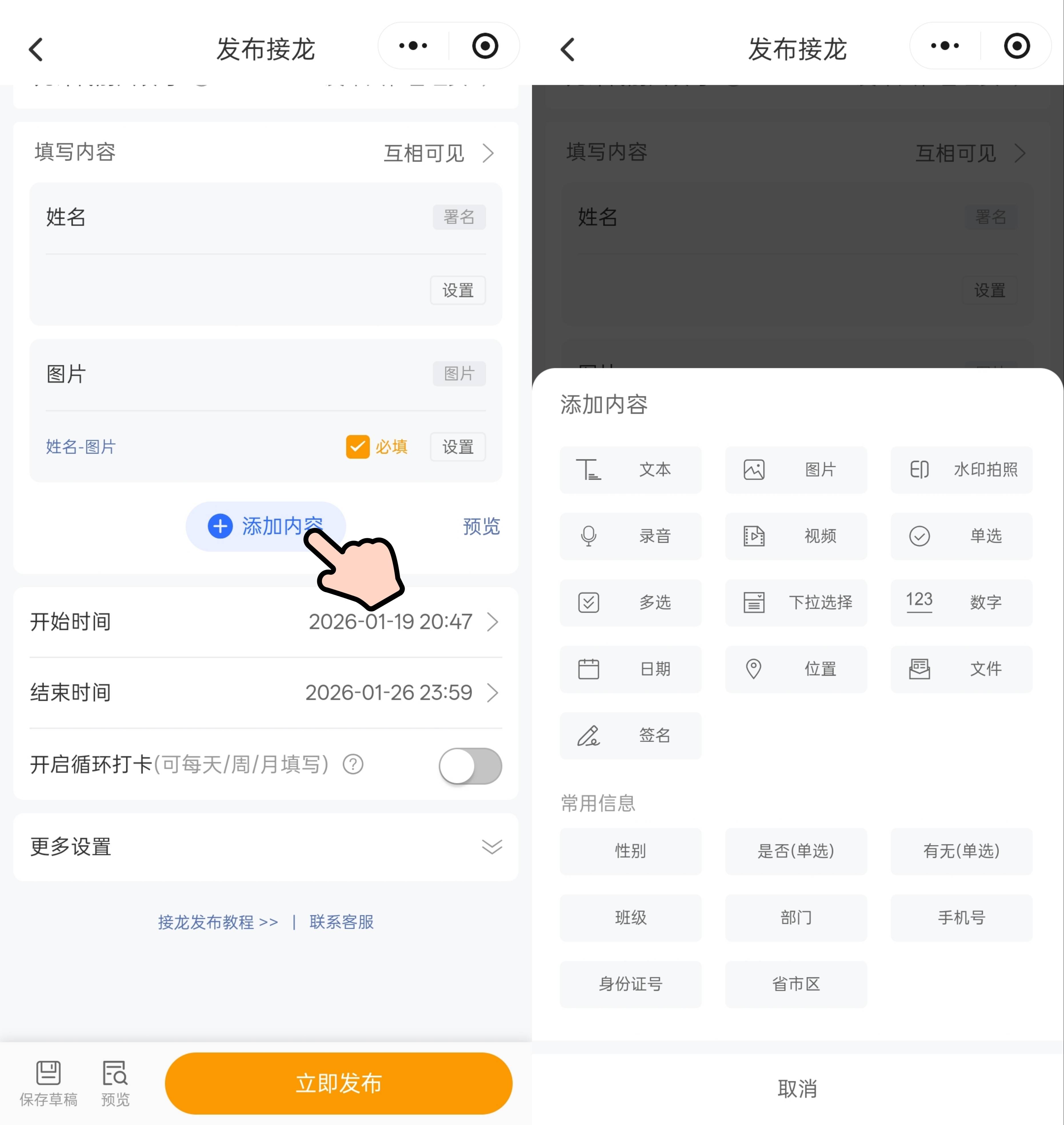 传统接龙只能收文字?接龙管家可 “全能” 多了!除了文字,还能收图片、视频、音频、Word/PPT/Excel 文档、压缩包,甚至支持水印拍照(防篡改)、定位打卡、手写签名 —— 想收集啥,添加对应表单项就行。班级收作业照片、公司收活动方案、社区收健康码…… 全能搞定!