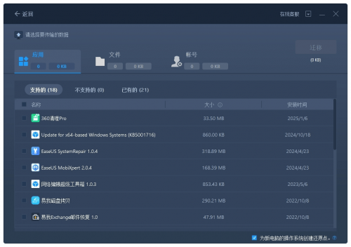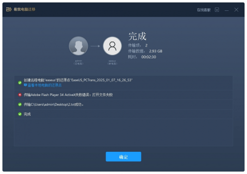 对于需要传输大量文件或者传输大型文件的用户来说,使用专业的文件传输软件可能更为高效。这里推荐大家使用易我电脑迁移,此软件支持在两台电脑之间传输文件(如文档、视频、图片等)、游戏、应用程序、账户和设置,操作简单,无需掌握技术知识。