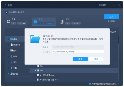 步骤3.选择需要迁移的文件,并选择迁移到的目标路径,点击“提交”。