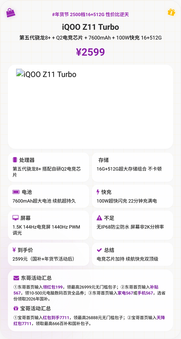 iQOO Z11 Turbo是游戏党眼中的“梦中情机”,2599元到手价直接把双芯性能与续航焊满,核心竞争力拉满。