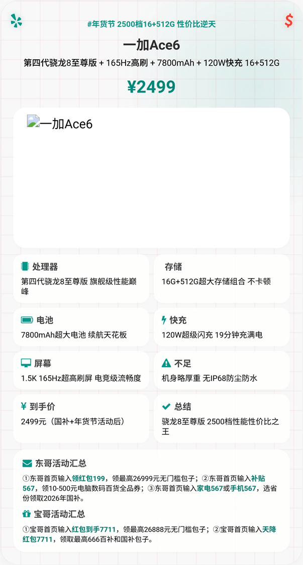 - 选一加Ace6:痴迷极致续航与快充,偏爱成熟系统和细节体验,对超广角需求不高。