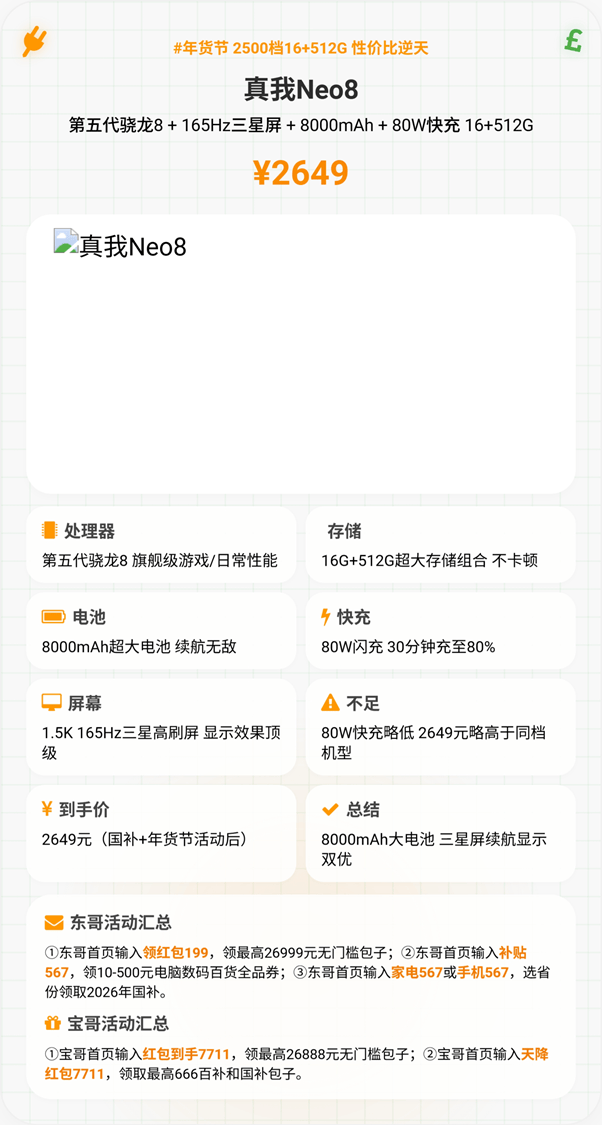 真我Neo8是续航刚需户的首选,2649元到手价把超大续航与三星好屏焊死,无明显体验短板。