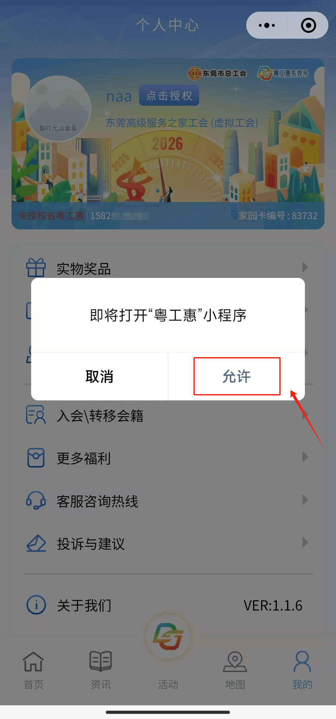 点击头像右侧【点击授权】,勾选【允许】,完成省粤工惠授权登录;