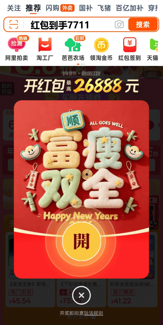 【淘宝平台】打开淘宝首页,搜索“红包到手7711”,领取最高26888元无门槛大红包,每天都能领,囤货越久省越多。