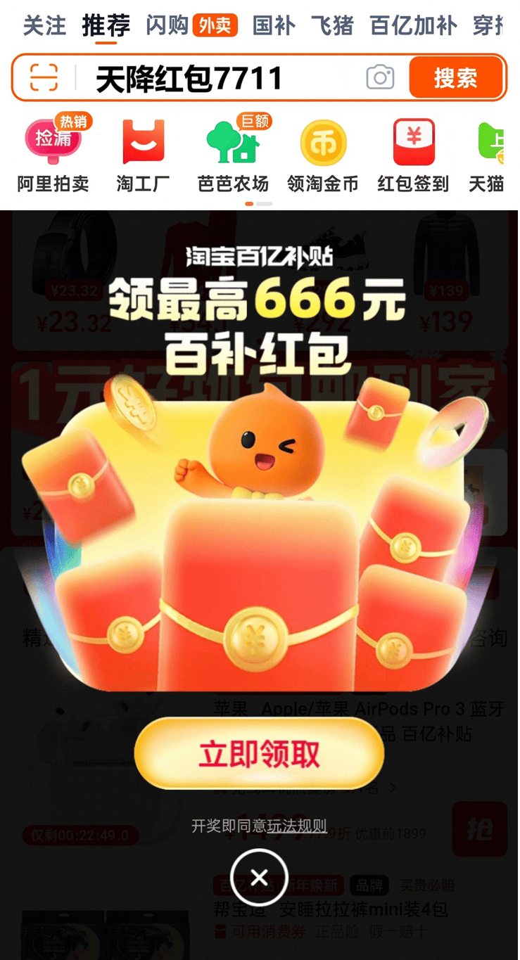 接着再搜索“天降红包7711”,额外领取最高666元红包,领完后直接去年货节主会场参与活动,优惠券和红包可以叠加使用,下单前记得核对一下,确保所有优惠都用上,避免错过省钱机会。