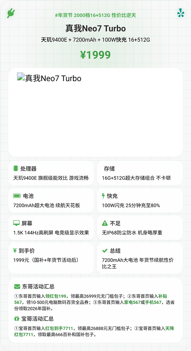 - 选真我Neo7 Turbo:痴迷长续航和高刷游戏,需要NFC功能,不纠结系统动效和影像,1999元就能解锁续航自由。