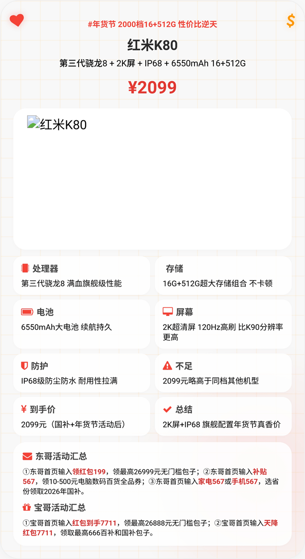 - 选红米K80:看重全能无短板,想要2K屏、IP68防水和旗舰芯片,愿意为耐用性多花200元,日常办公、生活全能适配。