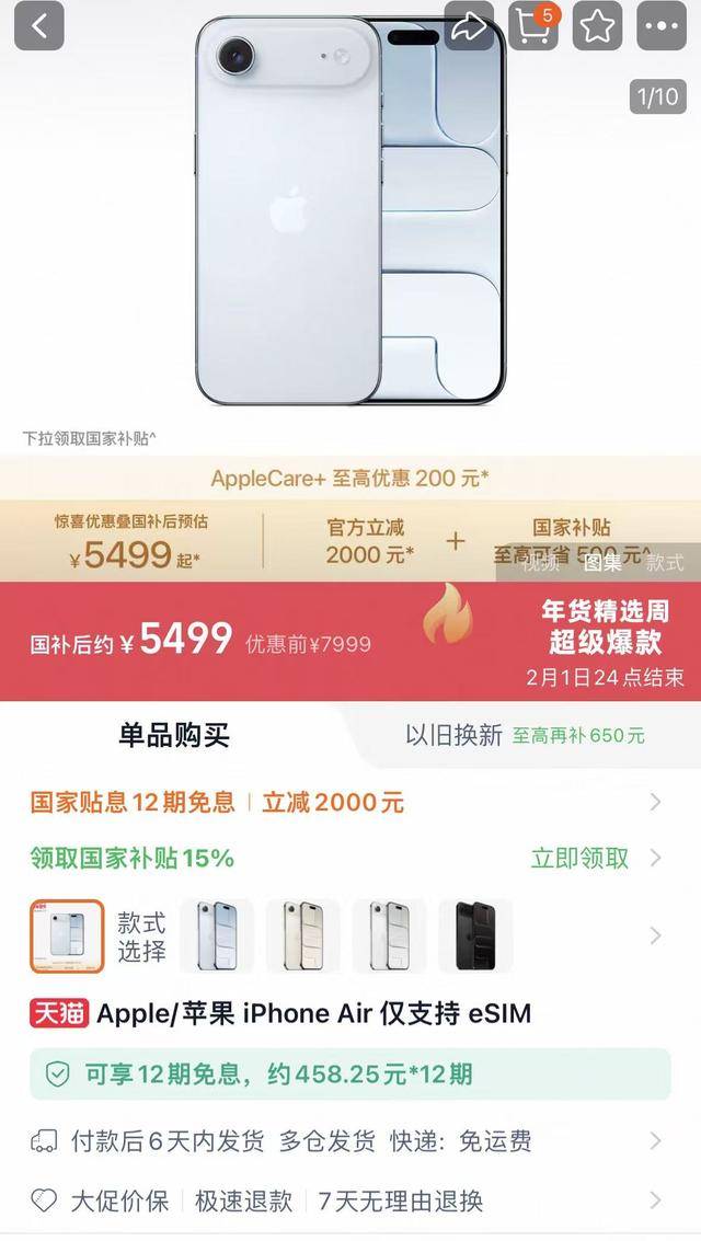 最近,上线仅3个多月的苹果iPhoneAir大降价引起关注。原价7999元起的iPhone Air直降2000元,叠加补贴到手价5499元起。