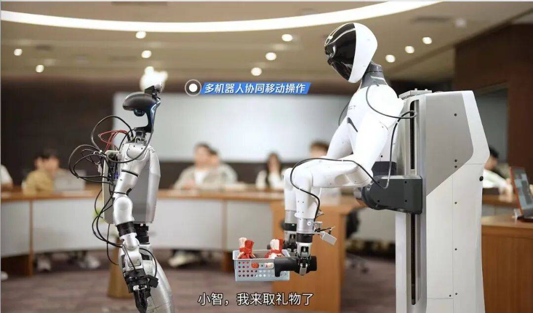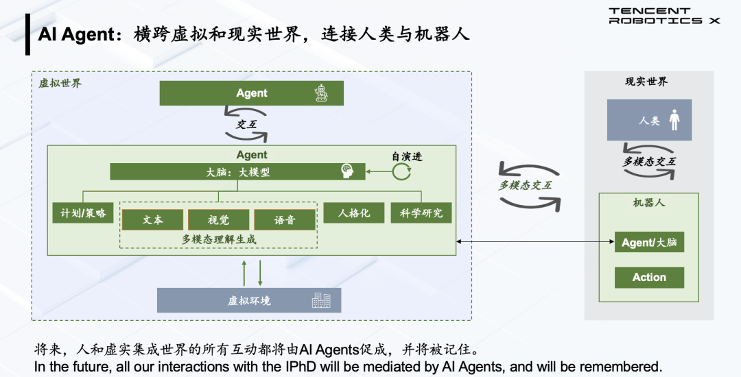 它所有的回答都是自动的,不是预设的。刚才看到的是单个机器人的演示,最近我们又有一些新的工作进展,也就是我们还没有对外发布的多智能体交互框架,包括一个虚拟的智能体,叫管家;还有两个实体机器人,一个是宇树的机器人,叫小宇;还有一个智元机器人,叫小智。每个智能体都有认知和行动的能力。又因为是多个智能体,所以它们共享了一些状态和记忆。我们通过腾讯的QQ来进行通讯,让机器人互相协作完成一个复杂任务。最近,这个多智能体参与了我们给优秀员工和优秀实习生进行的颁奖活动。