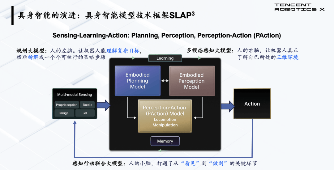 我们腾讯Robotics X从 2018 年初成立以来,经过了多年的引进——从最初的Slap,到现在的SLAP3(Sensing-Learning-Action: Planning, Perception, Perception-Action)。其中的这3个P是什么意思呢——规划、感知、感知行动。我现在简单用机器人推老人去晒太阳这个任务作为例子:
