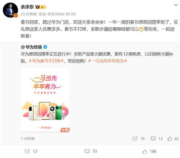 对此余承东表示:“春节回家,路过华为门店,欢迎大家来坐坐!一年一度的春节感恩回馈季到了,买礼物送家人优惠多多。春节不打烊,来散步遛娃喝咖啡都可以,等你来,一起迎新春!”