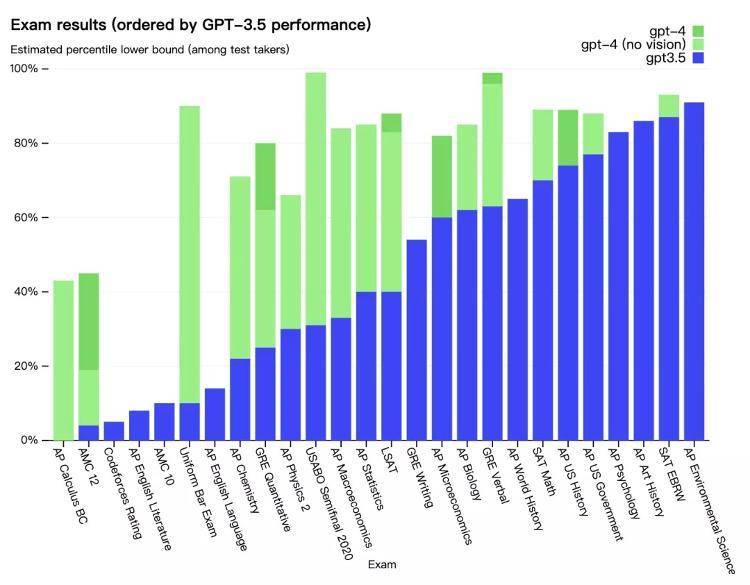 GPT-4相比GPT-3.5在各项考试中的成绩。