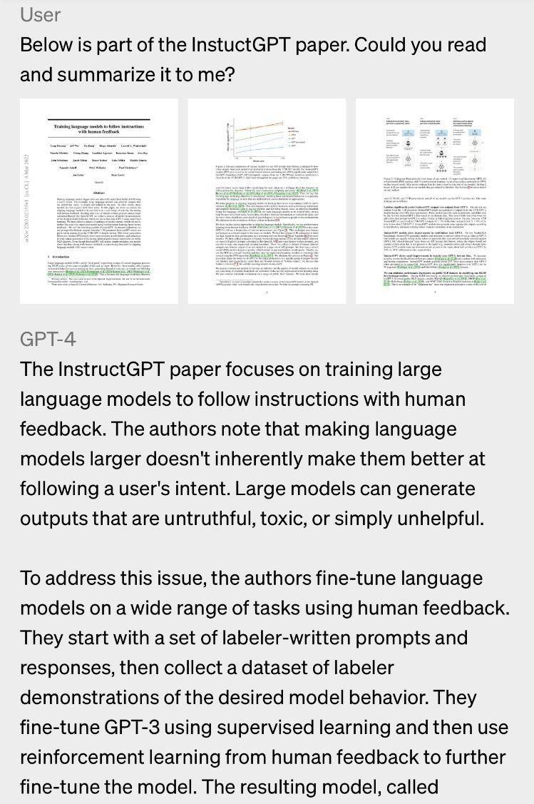 GPT-4可以接受文本和图像的提示语。比如,可以让用户指定任何视觉或语言任务,它可以生成文本输出(自然语言、代码等),给定的输入包括带有文字和照片的文件、图表或屏幕截图,GPT-4表现出与纯文本输入类似的能力。不过,目前图像输入仍然属于研究预览,不针对普通用户开放。