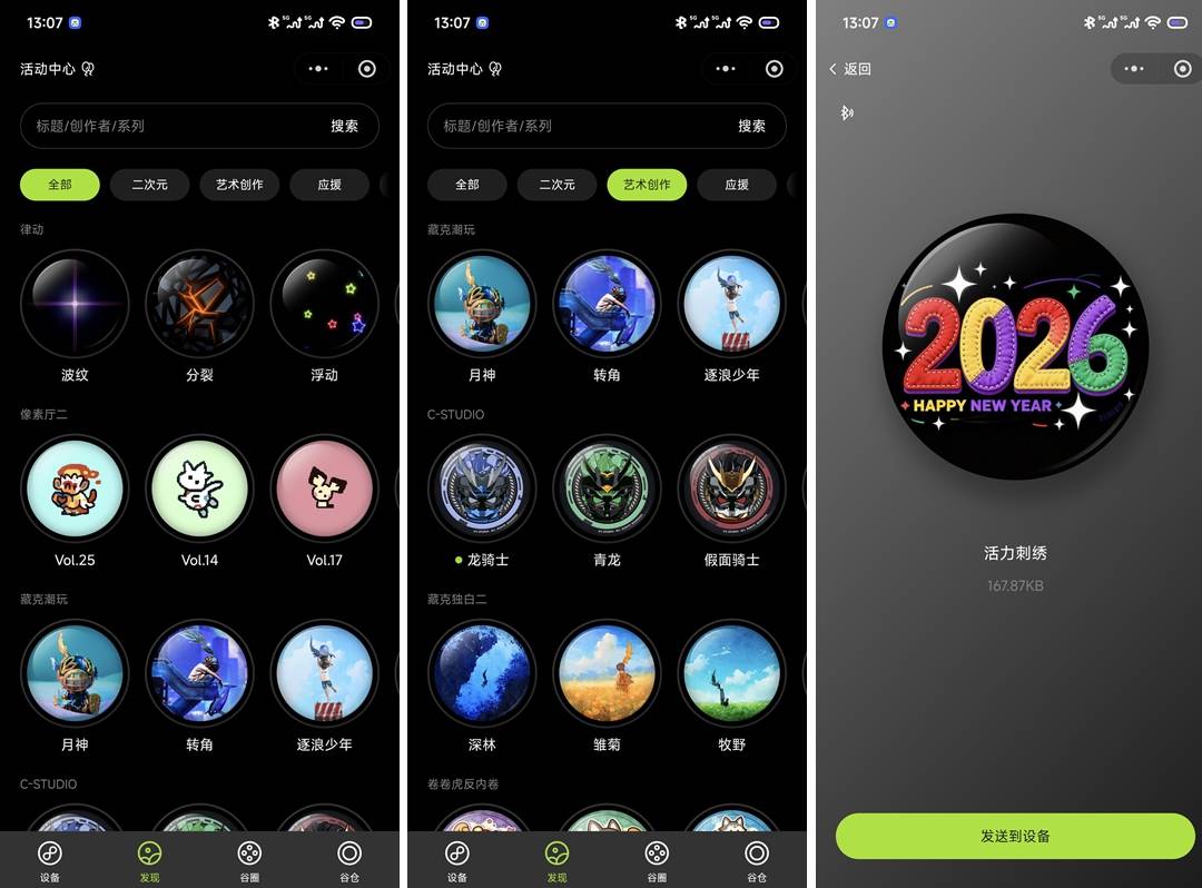 功能核心都在它的专属小程序里,用手机蓝牙一连就能操作。界面很直观,可以上传图片、GIF、视频、文字,甚至还有应援灯模式(演唱会神器!)。官方提供了海量动漫、游戏等二次元柄图可以直接下载,也可以自己发挥创意制作专属内容。支持格式非常多,基本常见的图片视频格式都能认,创作自由度高。