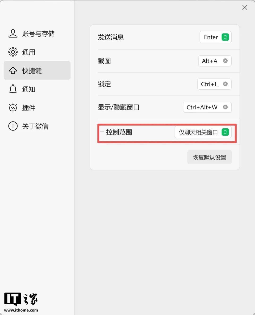 依次打开“三-设置-快捷键”界面,可以看到下方新增“控制范围”,可切换“所有窗口”或“仅聊天相关窗口”。