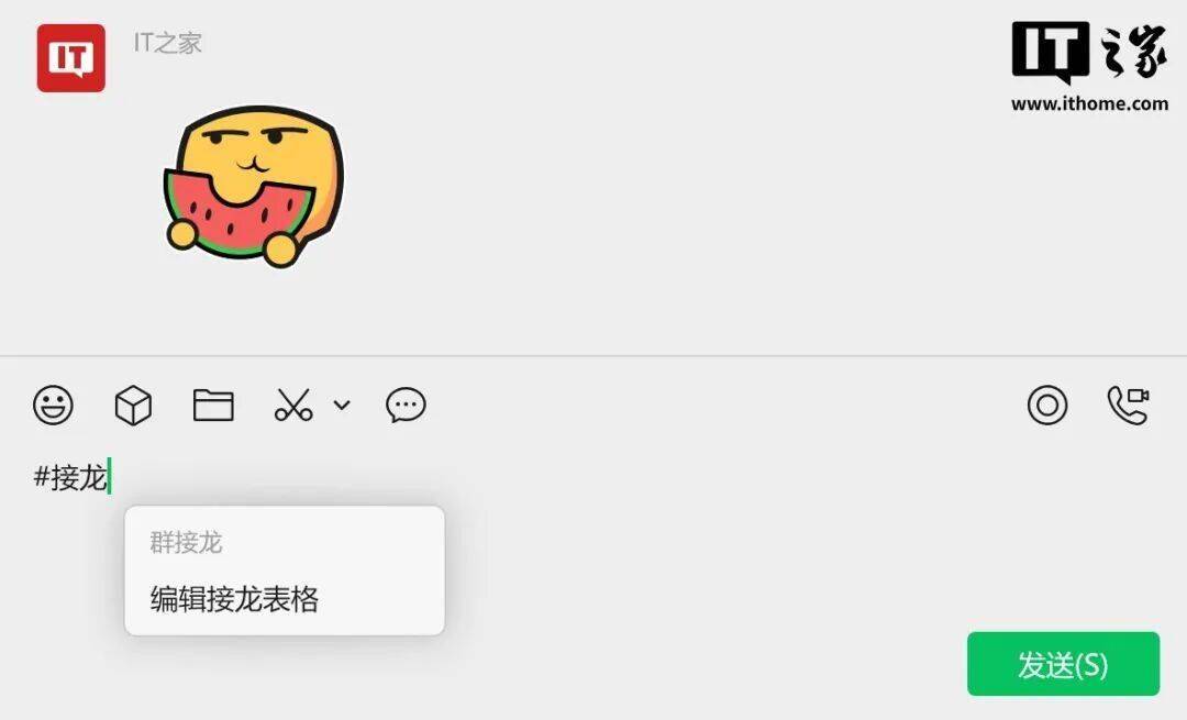 反观在 PC 端,没有单独的选项,发起接龙需要在聊天框手动输入“#接龙”,然后就能弹出“编辑接龙表格”的选项。
