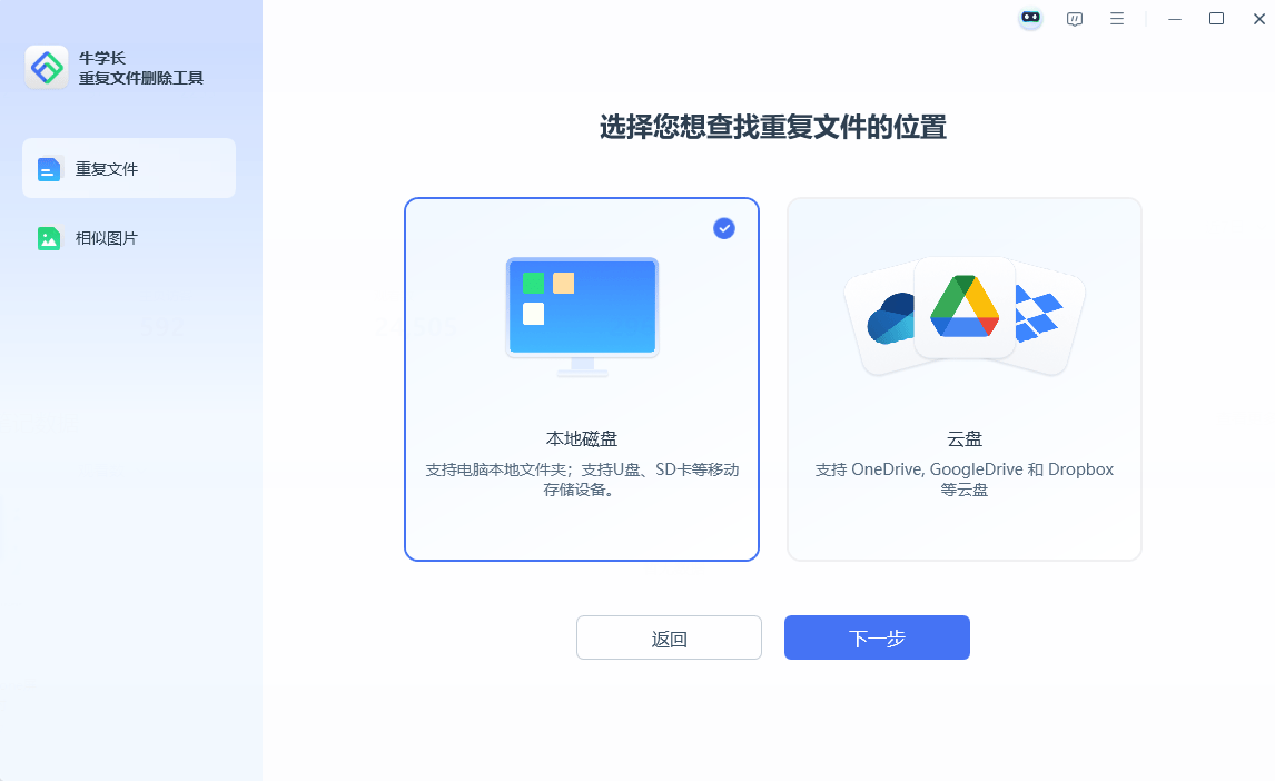 在您的电脑上下载并安装牛学长重复文件删除工具。然后选择“重复文件”功能点击开始,再选择想要查找重复文件的位置。