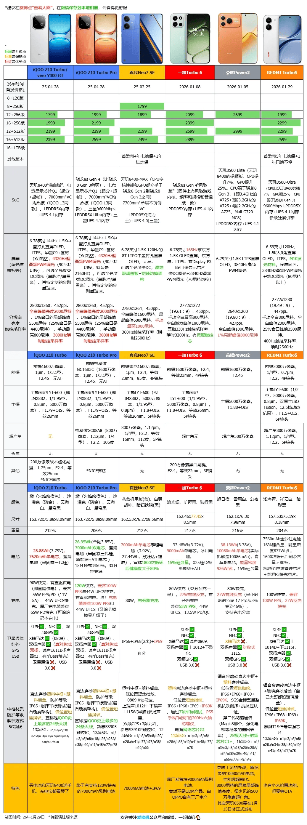 1999元起的【REDMI Turbo5】,与荣耀Power2、一加Turbo 6、iQOO Z10 Turbo/Turbo Pro、真我Neo7 SE对比↓