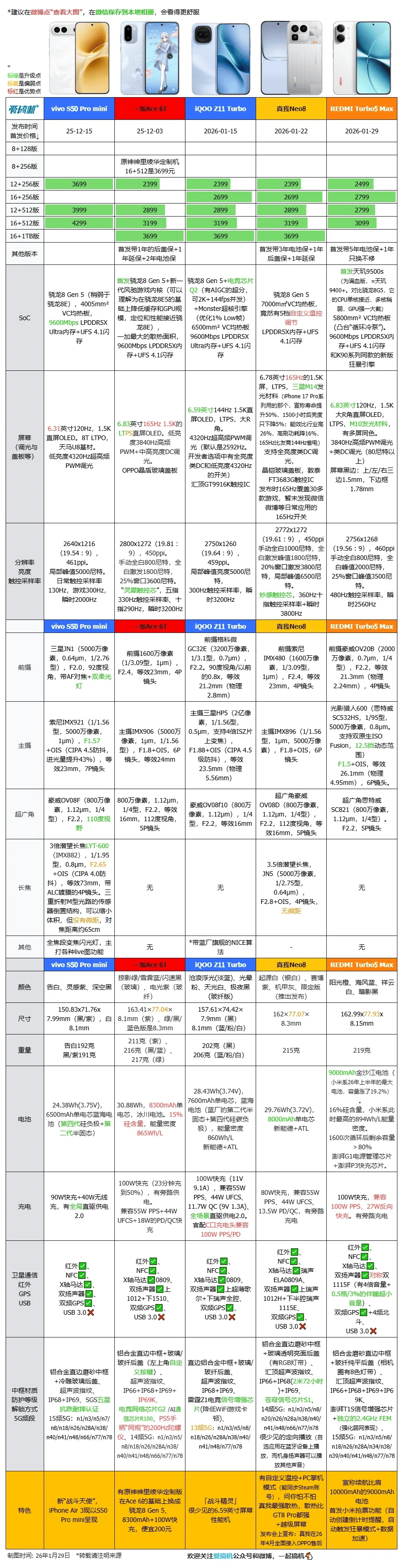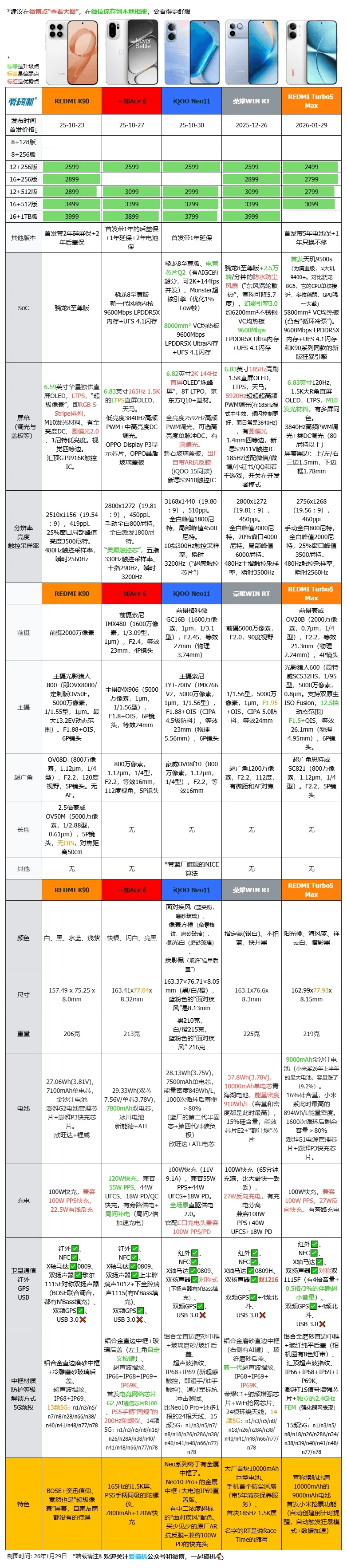 2499元起的【REDMI Turbo5 Max】与骁龙8 Gen 5的真我Neo8、iQOO Z11 Turbo、一加Ace 6T、vivo S50 Pro mini对比。