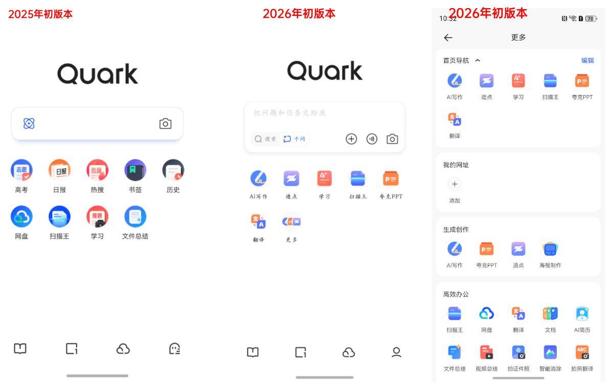 除此之外,阿里系的夸克在这一年时间的成长也非常快。2025 年 1 月的版本中,首页功能还是“基础款”,只有搜索框和高考、日报、热搜等 9 个入口,而到 2026 年 1 月的版本,搜索框中引入了千问,还增加了语音、上传文件等功能,同时首页的功能入口也极大丰富,点开“更多”,可以看到各种常用功能都已经支持了。