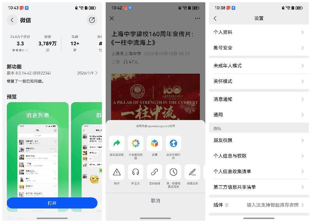 再看现在 2026 年初 8.0 版本的鸿蒙版微信,功能大大丰富了,比如文章分享界面,分享到朋友圈、收藏、还有语音朗读、投诉等重要功能都已经补齐。设置界面的选项也极大丰富,个人资料、关怀模式、朋友权限、插件等等各种功能都齐全了。总之一眼就能看出来前后的巨大差别。