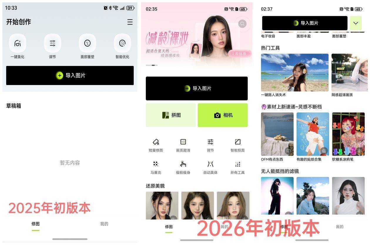 而到 2026 年 1 月再打开,就完全大变样了,不仅增加了拼图、画质超清、智能抠图、瘦脸瘦身、马赛克、自动美体等丰富的功能,而且界面也肉眼可见的美观丰富了,已经是一个基本成熟好用的修图 App 了。
